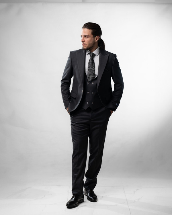 ست سه تیکه کت شلوار جلیقه مطهری طوسی تیره مدل ۷۶۶